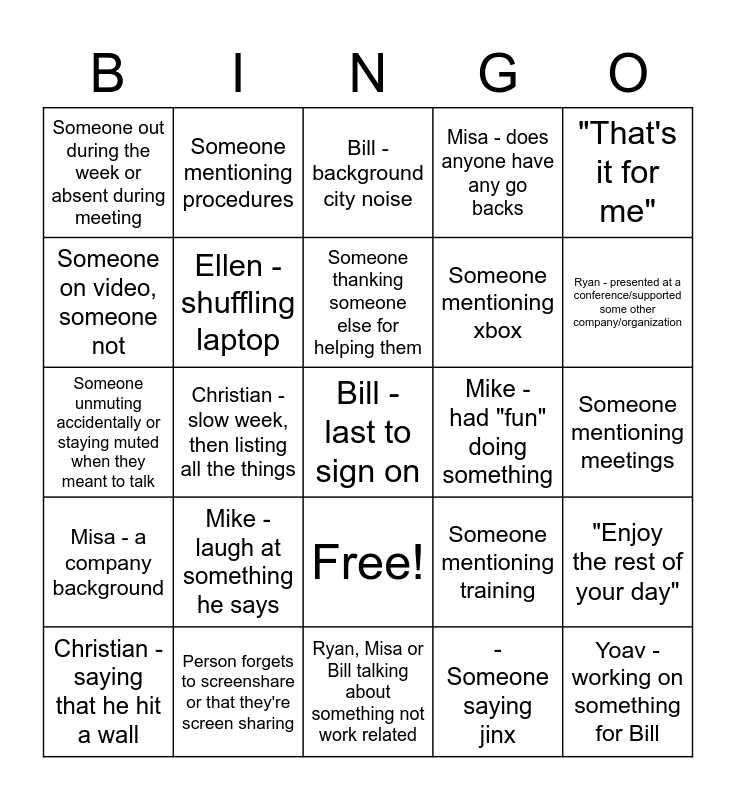This bingo card has 26 words: Free!, - Someone saying jinx, Someone thanking someone else for helping them, Person forgets to screenshare or that they're screen sharing, "That's it for me", Someone out during the week or absent during meeting, Someone on video, someone not, Someone mentioning procedures, Someone mentioning meetings, Someone mentioning training, Someone mentioning xbox, Someone unmuting accidentally or staying muted when they meant to talk, "Enjoy the rest of your day", Christian - saying that he hit a wall, Christian - slow week, then listing all the things, Misa - I don't have anything from (upper) management / Walt, Misa - does anyone have any go backs, Misa - a company background, Bill - background city noise, Bill - last to sign on, Ryan - presented at a conference/supported some other company/organization, Ryan, Misa or Bill talking about something not work related, Mike - had "fun" doing something, Mike - laugh at something he says, Ellen - shuffling laptop and Yoav - working on something for Bill.