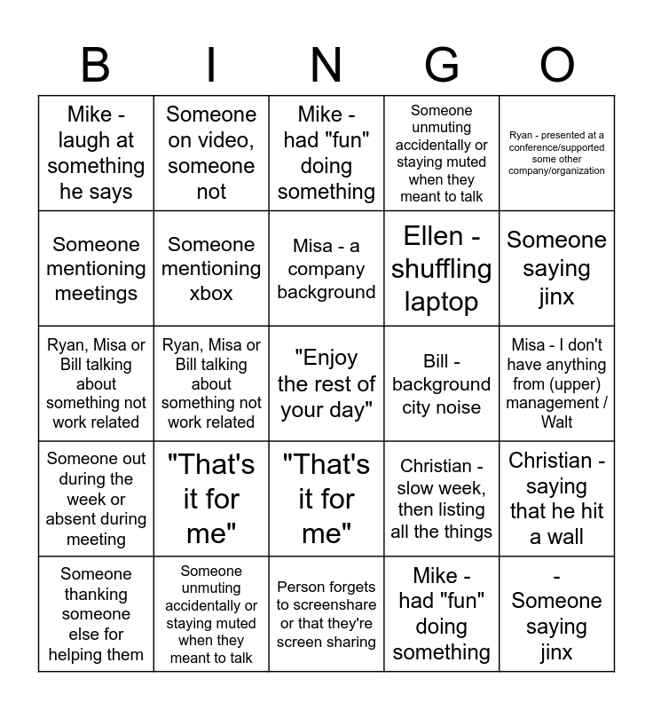 This bingo card has a free space and 49 words: Free!, - Someone saying jinx, Someone thanking someone else for helping them, Person forgets to screenshare or that they're screen sharing, "That's it for me", Someone out during the week or absent during meeting, Someone on video, someone not, Someone mentioning procedures, Someone mentioning meetings, Someone mentioning training, Someone mentioning xbox, Someone unmuting accidentally or staying muted when they meant to talk, Christian - saying that he hit a wall, Christian - slow week, then listing all the things, Misa - I don't have anything from (upper) management / Walt, Misa - does anyone have any go backs, Misa - a company background, Bill - background city noise, Bill - last to sign on, Ryan - presented at a conference/supported some other company/organization, Ryan, Misa or Bill talking about something not work related, Mike - had "fun" doing something, Mike - laugh at something he says, Ellen - shuffling laptop, Yoav - working on something for Bill, Someone saying jinx, Someone thanking someone else for helping them, Person forgets to screenshare or that they're screen sharing, "That's it for me", Someone out during the week or absent during meeting, Someone mentioning procedures, Someone mentioning meetings, Someone mentioning training, Someone mentioning xbox, Someone unmuting accidentally or staying muted when they meant to talk, "Enjoy the rest of your day", Christian - saying that he hit a wall, Christian - slow week, then listing all the things, Misa - I don't have anything from (upper) management / Walt, Misa - does anyone have any go backs, Misa - a company background, Bill - background city noise, Bill - last to sign on, Ryan - presented at a conference/supported some other company/organization, Ryan, Misa or Bill talking about something not work related, Mike - had "fun" doing something, Mike - laugh at something he says, Ellen - shuffling laptop and Yoav - working on something for Bill.