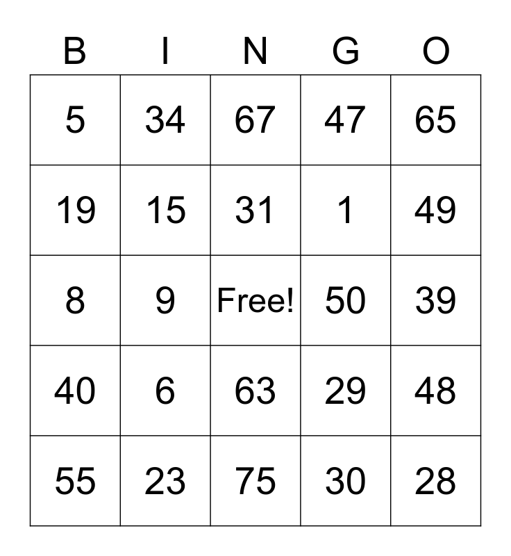 This bingo card has a free space and 24 words: 6, 23, 31, 55, 65, 5, 19, 34, 50, 63, 1, 8, 29, 48, 15, 30, 39, 67, 49, 9, 28, 40, 47 and 75.