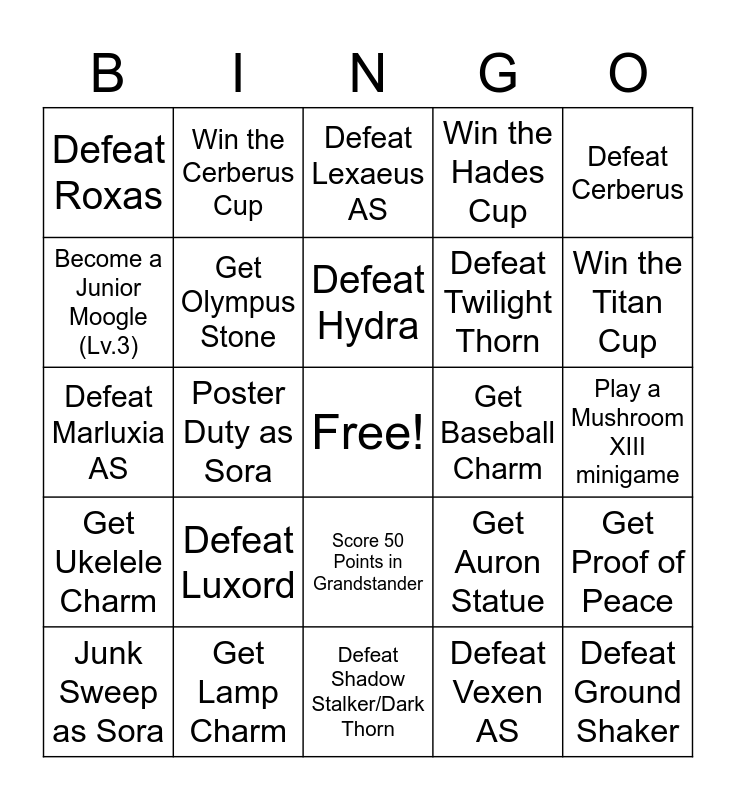 This bingo card has a free space and 101 words: Get the Mushroom XIII Chest, Spin Timeless Pete, Defeat Cerberus, Grab Tifa's Chest, Get Fire x, Defeat Pete in the Past, Defeat Zexion AS, Get No Experience, Defeat Beast, Grab Gull Wing's Chest, Play Light Cycle Minigame, Chase Down Shenzi, Buy something from the Peddler in Agrabah, Defeat Storm Rider, Visit Starry Hill, Defeat MCP, Get Ukelele Charm, Get a Money Pouch, Capture Lock Shock and Barrel, Get Blizzard x, Defeat Genie Jafar, Equip Struggle Bat (You can do this now), Get 13 Keyblades, Get Magnet x, Save in Slot 99, Win the Titan Cup, Win the Hades Cup, Defeat Luxord, Complete any Skateboard Minigame, Change Clothes, Win the Cerberus Cup, Defeat Lexaeus AS, Save Timon and Pumba, Bumble Buster as Sora, Defeat Prison Keeper, Score 50 Points in Grandstander, Defeat Xigbar, Win the Struggle Tournament, Defeat Vexen AS, Defeat Shadow Stalker/Dark Thorn, Defeat Possessor/Thresholder, Junk Sweep as Sora, Complete x Worlds, Complete a 12 piece puzzle, Get Cure x, Defeat Ground Shaker, Get Final Form Lv. x, Deliver the Mail as Sora, Get Feather Charm, Acquire EXACTLY 420 munny, Acquire 11,000 or more munny, Become a Junior Moogle (Lv.3), Make 270 Munny through Jobs as Sora, Find Ultima Weapon, Defeat The Experiment, Defeat Oogie Boogie, Get to Level X, Cargo Climb as Sora, Watch Goofy Die, Defeat Grim Reaper, Get Olympus Stone, Trigger Anti-Form, Get Proof of Connection, Defeat Scar, Get x Orichalcum+, Defeat Twilight Thorn, Defeat Captain Barbossa, Poster Duty as Sora, Get Lamp Charm, Defeat Axel as Roxas, Get Defeated by Lingering Will, Examine The Dart Board, Defeat Roxas, Get x Torn Pages, Defeat Hydra, Defeat Marluxia AS, Get a Membership Card, Get Wisdom Form Lv. x, Get Master Form Lv. x, Defeat Hostile Program, "Did somebody say the Door to Darkness", Win the Pain and Panic Cup, Get Baseball Charm, Lose the Struggle Tournament, Get Valor Form Lv. x, Defeat Demyx, Play a Mushroom XIII minigame, Get x Ansem Reports, Get Thunder x, Defeat Volcanic and Blizzard Lord, Get Auron Statue, Defeat Xaldin, Defeat 1000 Heartless, Get Presents, Defeat Saix, Get Proof of Peace, Get Proof of Nonexistence, Complete one Atlantica musical, Get Limit Form Lv. x, Defeat Larxene AS and Get Reflect x.