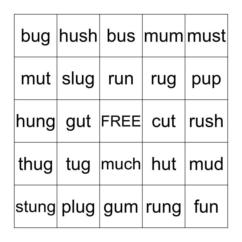 This bingo card has a free space and 24 words: tug, plug, run, stung, must, bug, mut, hush, cut, much, rug, hung, hut, mud, slug, rung, rush, bus, pup, gut, fun, thug, mum and gum.