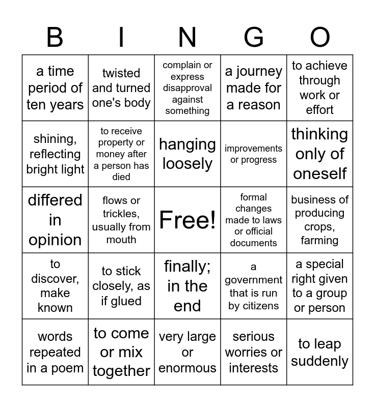 This bingo card has a free space and 24 words: to stick closely, as if glued, to come or mix together, hanging loosely, words repeated in a poem, to achieve through work or effort, a time period of ten years, shining, reflecting bright light, twisted and turned one's body, formal changes made to laws or official documents, finally; in the end, improvements or progress, differed in opinion, a government that is run by citizens, a special right given to a group or person, to receive property or money after a person has died, serious worries or interests, business of producing crops, farming, complain or express disapproval against something, thinking only of oneself, flows or trickles, usually from mouth, to leap suddenly, to discover, make known, a journey made for a reason and very large or enormous.