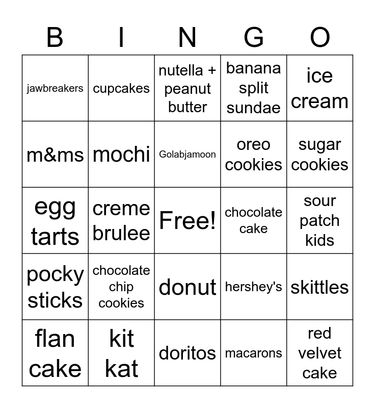 This bingo card has a free space and 24 words: chocolate chip cookies, kit kat, Golabjamoon, flan cake, ice cream, jawbreakers, m&ms, cupcakes, chocolate cake, donut, oreo cookies, egg tarts, hershey's, skittles, mochi, macarons, sour patch kids, nutella + peanut butter, sugar cookies, creme brulee, red velvet cake, pocky sticks, banana split sundae and doritos.