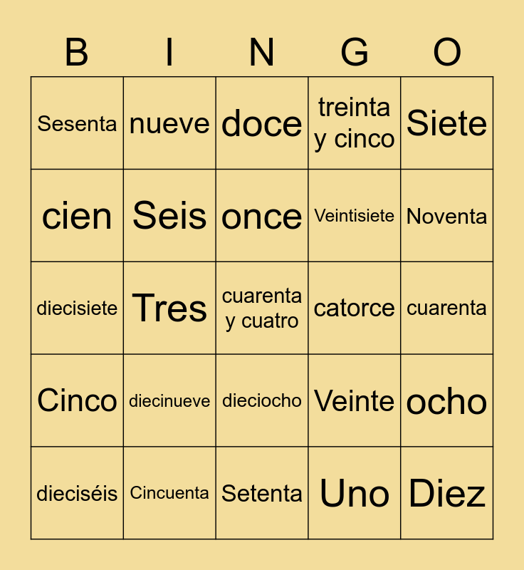 This bingo card has 32 words: Uno, Dos, Tres, Cuatro, Cinco, Seis, Siete, ocho, nueve, Diez, once, doce, Free!, trece, catorce, quince, dieciséis, diecisiete, dieciocho, diecinueve, Veinte, treinta, cuarenta, Cincuenta, cuarenta y cuatro, treinta y cinco, Veintisiete, cien, Sesenta, Setenta, Ochenta and Noventa.