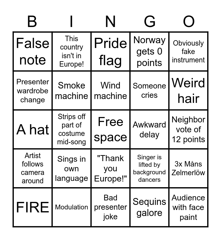 This bingo card has a free space and 24 words: Sings in own language, Modulation, Wind machine, FIRE, Obviously fake instrument, False note, Presenter wardrobe change, This country isn't in Europe!, Awkward delay, "Thank you Europe!", Someone cries, A hat, Singer is lifted by background dancers, 3x Måns Zelmerlöw, Smoke machine, Sequins galore, Neighbor vote of 12 points, Pride flag, Weird hair, Strips off part of costume mid-song, Audience with face paint, Artist follows camera around, Norway gets 0 points and Bad presenter joke.