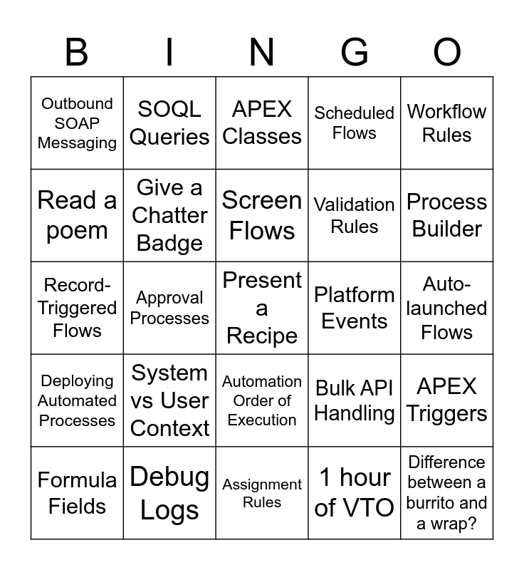 This bingo card has a free space and 24 words: Formula Fields, System vs User Context, Screen Flows, 1 hour of VTO, Workflow Rules, Outbound SOAP Messaging, SOQL Queries, APEX Classes, Platform Events, Auto-launched Flows, Record-Triggered Flows, Give a Chatter Badge, Bulk API Handling, APEX Triggers, Read a poem, Debug Logs, Assignment Rules, Scheduled Flows, Process Builder, Deploying Automated Processes, Approval Processes, Automation Order of Execution, Validation Rules and Difference between a burrito and a wrap?.