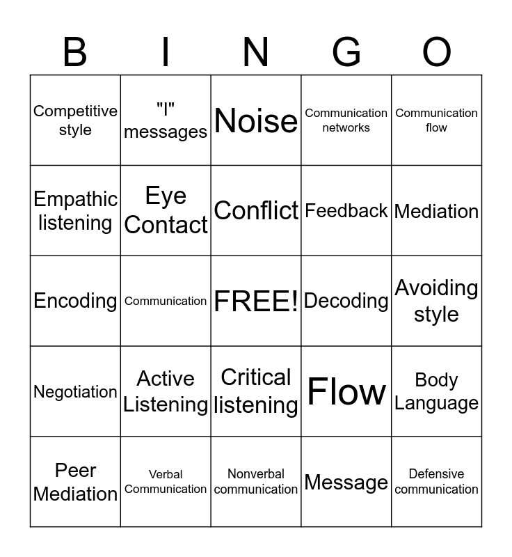 This bingo card has a free space and 24 words: Active Listening, Verbal Communication, Conflict, Peer Mediation, Communication flow, Competitive style, Empathic listening, "I" messages, Decoding, Critical listening, Feedback, Encoding, Flow, Body Language, Eye Contact, Message, Avoiding style, Noise, Mediation, Communication, Defensive communication, Negotiation, Communication networks and Nonverbal communication.