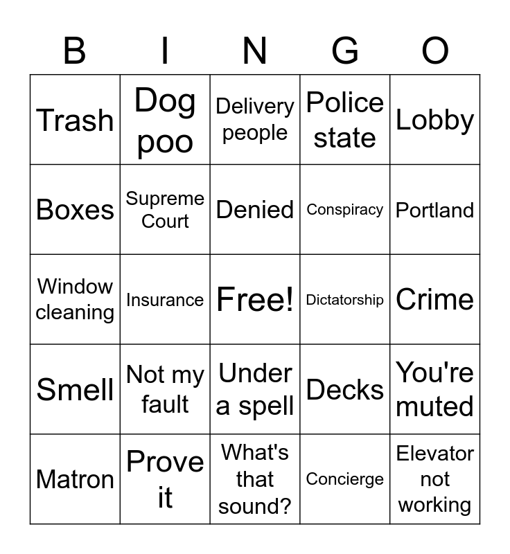 This bingo card has a free space and 24 words: Not my fault, Prove it, Denied, Matron, Lobby, Trash, Boxes, Dog poo, Dictatorship, Under a spell, Conspiracy, Window cleaning, Decks, You're muted, Supreme Court, Concierge, Crime, Delivery people, Portland, Insurance, Elevator not working, Smell, Police state and What's that sound?.