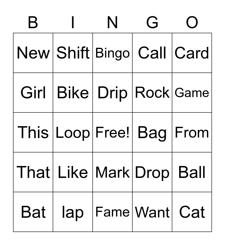 This bingo card has a free space and 29 words: Bat, Dog, Loop, These, New, Bingo, Bike, Like, Bag, lap, From, Cat, Fame, Want, Game, free, Mark, That, Card, This, Drop, Drop, Rock, Girl, Call, Shift, Ball, Drip and Clip.