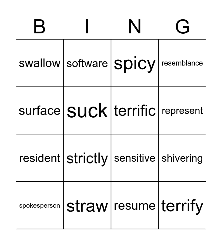 This bingo card has 16 words: straw, shivering, spicy, swallow, resident, software, sensitive, resume, surface, suck, spokesperson, resemblance, strictly, represent, terrific and terrify.