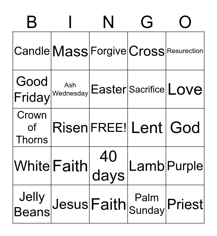 This bingo card has a free space and 24 words: Faith, Jesus, Easter, Jelly Beans, Resurection, Candle, Good Friday, Mass, Lent, 40 days, Sacrifice, Crown of Thorns, Lamb, Purple, Ash Wednesday, Palm Sunday, God, Forgive, Love, Risen, Priest, White, Cross and Faith.