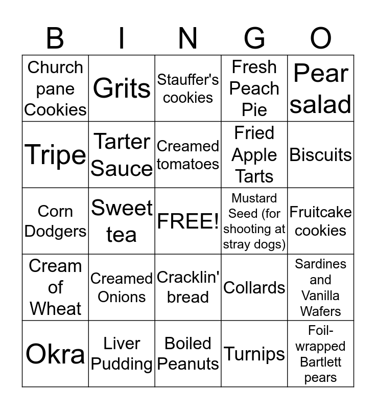 This bingo card has a free space and 41 words: Fried Chicken, Corn Dodgers, Chicken Stolzfus, Tarter Sauce, Liver Pudding, Cracklin' bread, Creamed tomatoes, Blowed eggs, Pear salad, Cream of Wheat, Sweet tea, Fresh Peach Pie, Foil-wrapped Bartlett pears, Fruitcake cookies, Mustard Seed (for shooting at stray dogs), Creamed Onions, Homemade wine (must bury before drinking), Church pane Cookies, Werther's Original (for candy jar), Stauffer's cookies, Sardines and Vanilla Wafers, Liver and Onions, Boiled Peanuts, Fried Apple Tarts, Pigfeet, Gravy, Turnips, Rutabagas, Biscuits, Fishfry, Sausage, Grits, Okra, Scuppernongs, Collards, Tripe, Hoecakes, Cornbread, Ambrosia, "Trash" and CreamedCorn.