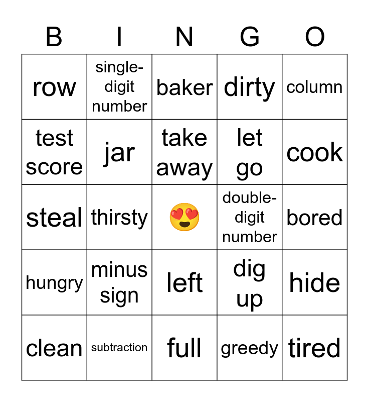 This bingo card has a free space and 24 words: minus sign, subtraction, take away, clean, column, row, test score, single-digit number, double- digit number, left, let go, steal, dig up, hide, jar, greedy, bored, baker, cook, thirsty, tired, hungry, dirty and full.