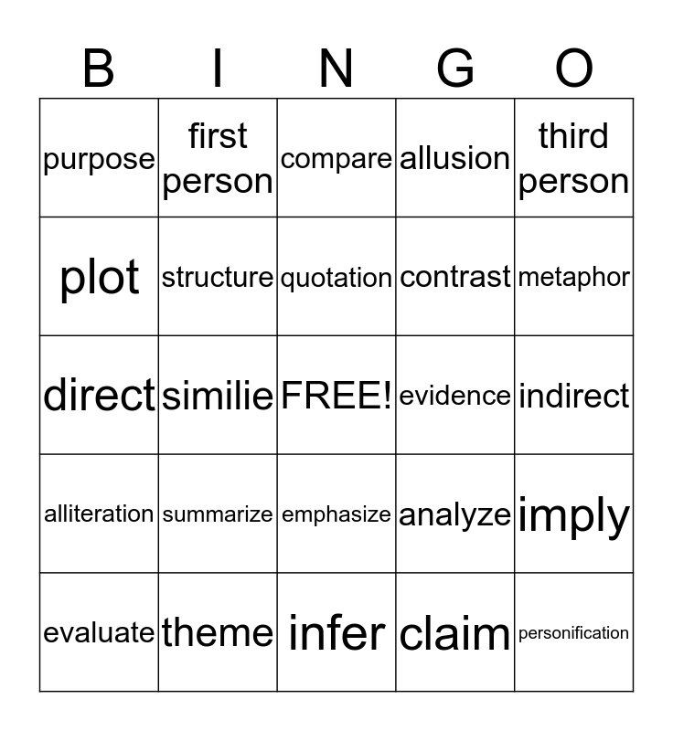 This bingo card has a free space and 24 words: summarize, theme, quotation, evaluate, third person, purpose, plot, first person, evidence, emphasize, contrast, direct, analyze, imply, structure, claim, indirect, compare, metaphor, similie, personification, alliteration, allusion and infer.