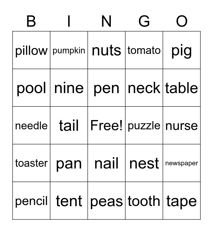 This bingo card has a free space and 25 words: pan, peas, pen, pencil, pig, pillow, pool, pumpkin, puzzle, nail, neck, needle, nest, newspaper, nine, nose, nurse, nuts, table, tail, tape, tent, toaster, tomato and tooth.