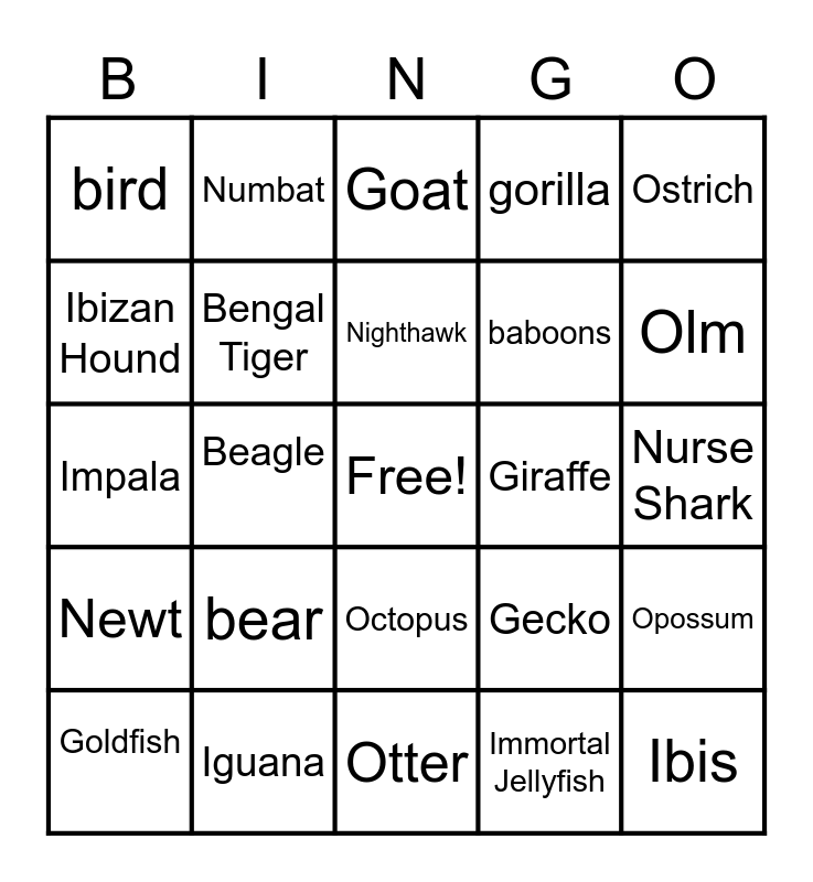 This bingo card has a free space and 24 words: bear, Iguana, Nighthawk, Goldfish, Ostrich, bird, Ibizan Hound, Numbat, Giraffe, Octopus, baboons, Impala, Gecko, Opossum, Bengal Tiger, Immortal Jellyfish, Nurse Shark, Goat, Olm, Beagle, Ibis, Newt, gorilla and Otter.