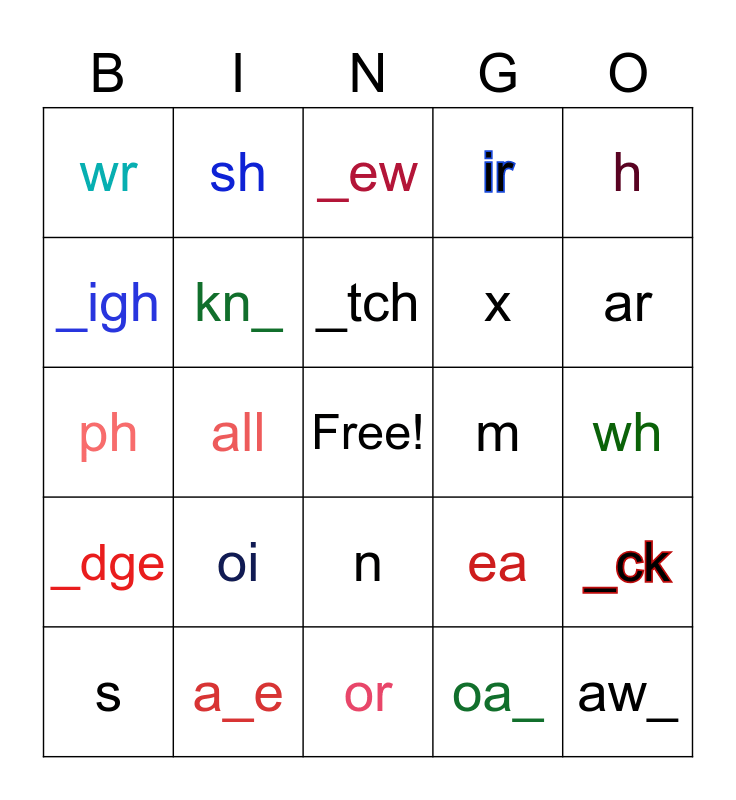 This bingo card has a free space and 27 words: ea, ow, x, or, _igh, _ew, sh, _dge, m, _ck, ph, ir, s, a_e, ar, th, kn_, _tch, oi, wr, wh, oa_, all, aw_, n, h and l.