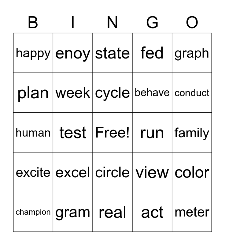 This bingo card has a free space and 24 words: excel, gram, cycle, champion, graph, happy, plan, enoy, run, circle, behave, human, view, color, week, act, family, state, conduct, test, meter, excite, fed and real.