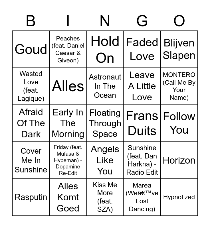 This bingo card has 41 words: Free!, Afraid Of The Dark, All We Got (feat. KIDDO), Alles, Alles Komt Goed, Angels Like You, Astronaut In The Ocean, BED, Blijven Slapen, Cover Me In Sunshine, Early In The Morning, Faded Love, Floating Through Space, Follow You, Frans Duits, Friday (feat. Mufasa & Hypeman) - Dopamine Re-Edit, Good Without, Goud, Higher Power, Hold On, Horizon, Hypnotized, Kiss Me More (feat. SZA), Leave A Little Love, Leave The Door Open, Little Bit of Love, Marea (We’ve Lost Dancing), Miss You, MONTERO (Call Me By Your Name), No Diggity, Nobody Is Perfect, Peaches (feat. Daniel Caesar & Giveon), Rasputin, Rise, Sunshine (feat. Dan Harkna) - Radio Edit, Wasted Love (feat. Lagique), Wellerman - Sea Shanty / 220 KID x Billen Ted Remix, We're Good, You, Your Love (9PM) and Your Power.