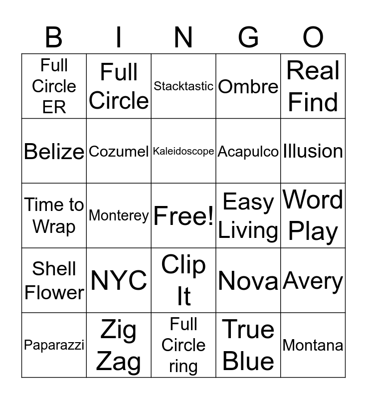 This bingo card has a free space and 24 words: NYC, Zig Zag, Kaleidoscope, Paparazzi, Real Find, Full Circle ER, Belize, Full Circle, Easy Living, Clip It, Acapulco, Time to Wrap, Nova, Avery, Cozumel, True Blue, Word Play, Stacktastic, Illusion, Monterey, Montana, Shell Flower, Ombre and Full Circle ring.