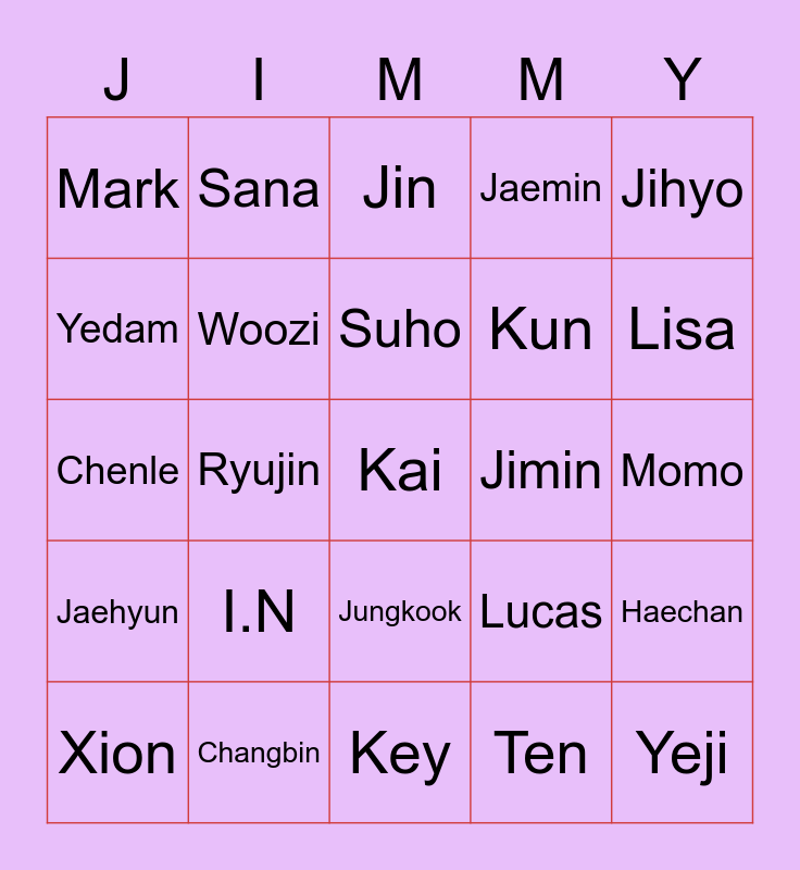 This bingo card has 50 words: Baekhyun, Kai, Taemin, Key, I.N, Lia, Sana, Rosé, Yedam, The8, Woozi, Jaemin, Haechan, Lucas, Jeno, Chen, Suho, Jimin, V, Jihyo, Ryujin, Ten, Mark, Kun, Renjun, Yeji, Lisa, Jisoo, Jin, Jungkook, RM, Hyunjin, Doyoung, Lee know, Changbin, Chanyeol, Hoshi, Joshua, Dahyun, Momo, IU, Jennie, Hwasa, Ravn, Xion, Chenle, Minho, Winwin, Jaehyun and Solar.