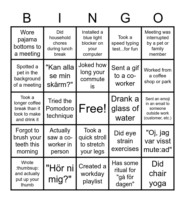 This bingo card has a free space and 24 words: Actually saw a co-worker in person, "Hör ni mig?", Joked how long your commute is, Wrote :thumbsup: and actually put up your thumb, Meeting was interrupted by a pet or family member, Wore pajama bottoms to a meeting, Spotted a pet in the background of a meeting, Did household chores during lunch break, Drank a glass of water, Took a quick stroll to stretch your legs, Sent a gif to a co-worker, Took a longer coffee break than it took to make and drink it, Did eye strain exercises, "Oj, jag var visst mute:ad", "Kan alla se min skärm?", Has some ritual for "gå för dagen", Sent an emoji in an email to someone outside work (customer, etc.), Installed a blue light blocker on your computer, Worked from a coffee shop or park, Tried the Pomodoro technique, Did chair yoga, Forgot to brush your teeth this morning, Took a speed typing test...for fun and Created a workday playlist.