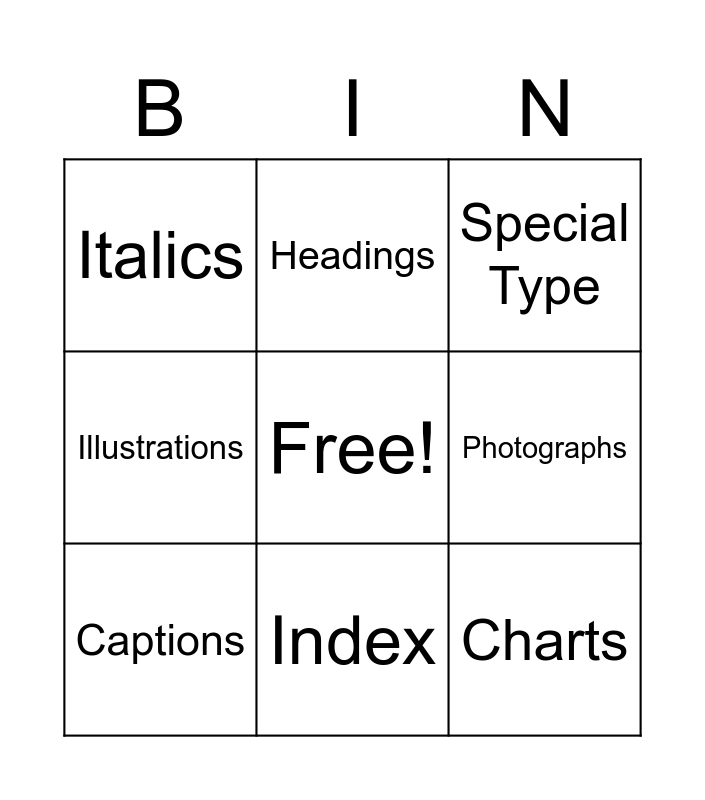 This bingo card has a free space and 13 words: Bold Type, Table of Contents, Captions, Headings, Illustrations, Charts, Maps, Glossary, Index, Italics, Photographs, Special Type and Title.