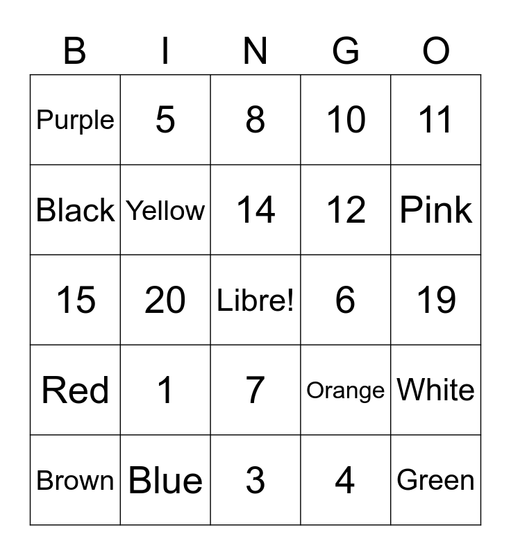 This bingo card has a free space and 24 words: 1, Blue, 14, Brown, 11, Purple, Black, 5, 6, 7, 12, 15, Orange, White, Yellow, 4, 19, 8, Pink, 20, Green, Red, 10 and 3.