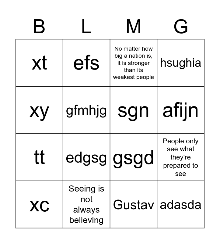 This bingo card has 20 words: People only see what they're prepared to see, To be Negro in America is to hope against hope, No matter how big a nation is, it is stronger than its weakest people, x, xc, xy, Seeing is not always believing, xt, tt, efs, edgsg, gsgd, gfmhjg, adasda, sgn, zfwg, afijn, hsughia, Gustav and caufhs.