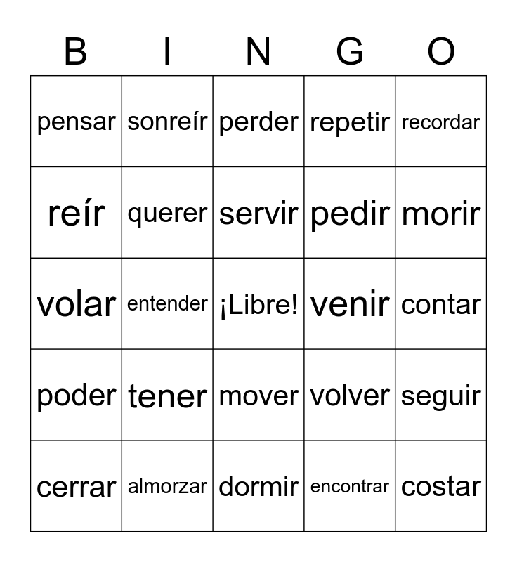 This bingo card has a free space and 29 words: cerrar, comenzar, entender, mentir, pensar, perder, querer, tener, venir, almorzar, contar, costar, dormir, encontrar, morir, mostrar, mover, poder, recordar, volar, volver, decir, pedir, reír, repetir, sonreír, seguir, servir and jugar.