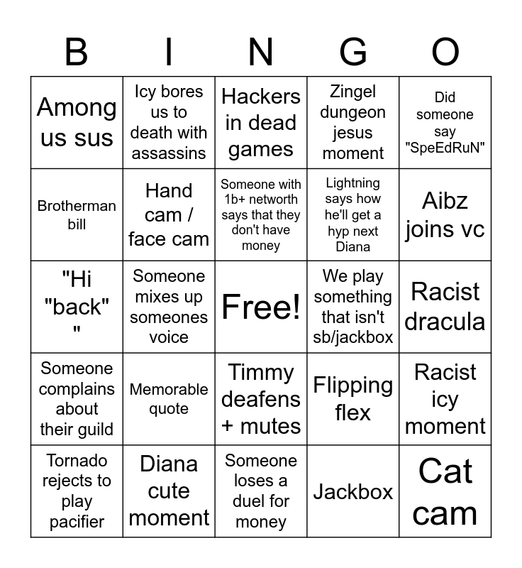 This bingo card has a free space and 24 words: Memorable quote, Diana cute moment, Someone with 1b+ networth says that they don't have money, Tornado rejects to play pacifier, Did someone say "SpeEdRuN", Among us sus, Brotherman bill, Icy bores us to death with assassins, We play something that isn't sb/jackbox, Timmy deafens + mutes, Lightning says how he'll get a hyp next Diana, "Hi "back" ", Flipping flex, Racist icy moment, Hand cam / face cam, Jackbox, Racist dracula, Hackers in dead games, Aibz joins vc, Someone mixes up someones voice, Cat cam, Someone complains about their guild, Zingel dungeon jesus moment and Someone loses a duel for money.