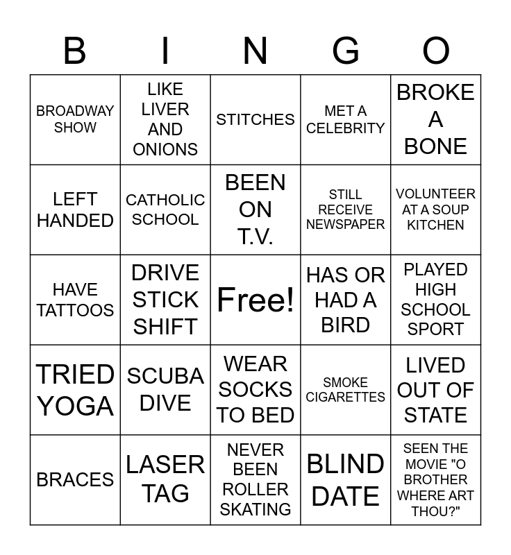 This bingo card has a free space and 24 words: SCUBA DIVE, LASER TAG, BEEN ON T.V., BRACES, BROKE A BONE, BROADWAY SHOW, LEFT HANDED, LIKE LIVER AND ONIONS, HAS OR HAD A BIRD, WEAR SOCKS TO BED, STILL RECEIVE NEWSPAPER, HAVE TATTOOS, SMOKE CIGARETTES, LIVED OUT OF STATE, CATHOLIC SCHOOL, BLIND DATE, PLAYED HIGH SCHOOL SPORT, STITCHES, VOLUNTEER AT A SOUP KITCHEN, DRIVE STICK SHIFT, SEEN THE MOVIE "O BROTHER WHERE ART THOU?", TRIED YOGA, MET A CELEBRITY and NEVER BEEN ROLLER SKATING.