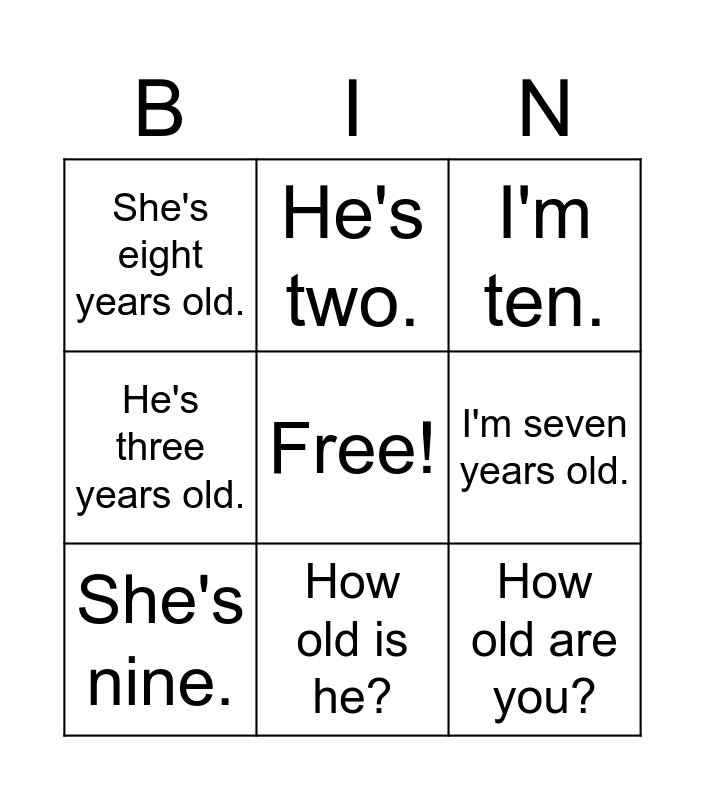 This bingo card has a free space and 11 words: How old is she?, How old is he?, How old are you?, She's nine., He's two., I'm ten., I'm seven years old., She's five years old., He's three years old., She's eight years old. and I'm eleven..