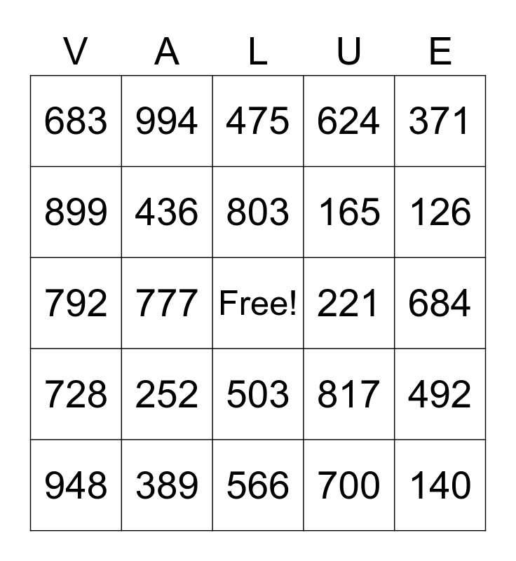 This bingo card has a free space and 24 words: 252, 389, 803, 948, 371, 683, 899, 994, 221, 503, 165, 792, 817, 492, 436, 700, 684, 475, 126, 777, 140, 728, 624 and 566.