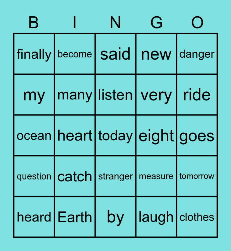 This bingo card has 30 words: heard, change, listen, young, danger, finally, become, stranger, eight, clothes, question, many, class, laugh, tomorrow, father, heart, today, measure, ride, ocean, Earth, said, very, goes, my, catch, by, new and talk.