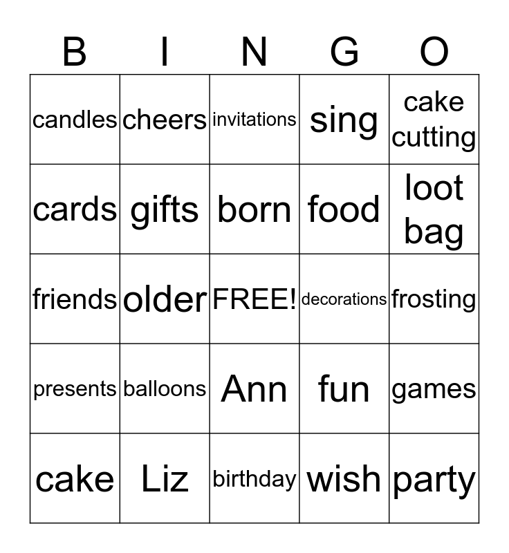 This bingo card has a free space and 25 words: balloons, birthday, born, cake, cake cutting, candles, cards, cheers, decorations, Ann, food, friends, fun, games, gifts, guests, frosting, invitations, loot bag, older, party, Liz, presents, sing and wish.