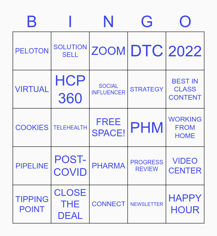 This bingo card has a free space and 29 words: TIPPING POINT, KILLING IT, TELEHEALTH, UPFRONTS, PELOTON, ZOOM, HCP 360, POST-COVID, PHM, CLOSE THE DEAL, WORKING FROM HOME, HAPPY HOUR, CONNECT, NEWSLETTER, BEST IN CLASS CONTENT, RIGHT NOW, PHARMA, PIPELINE, 2022, COOKIES, PROGRESS REVIEW, CASE STUDY, STRATEGY, VIRTUAL, DTC, SOLUTION SELL, VIDEO CENTER, SOCIAL INFLUENCER and YOY GROWTH.