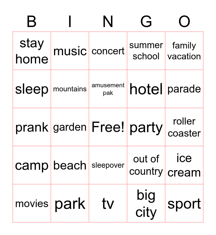 This bingo card has a free space and 24 words: beach, park, amusement pak, movies, family vacation, stay home, sleep, music, party, sleepover, hotel, prank, out of country, ice cream, mountains, big city, roller coaster, concert, parade, garden, sport, camp, summer school and tv.
