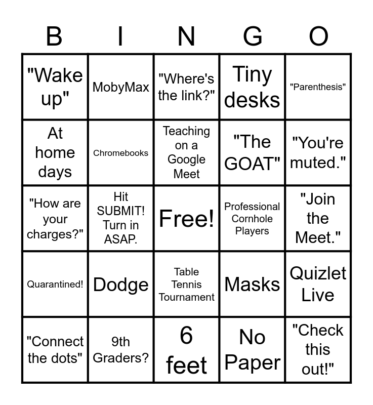This bingo card has a free space and 24 words: Dodge, 9th Graders?, Teaching on a Google Meet, "Connect the dots", "Parenthesis", "Wake up", At home days, MobyMax, Professional Cornhole Players, Table Tennis Tournament, "The GOAT", "How are your charges?", Masks, Quizlet Live, Chromebooks, No Paper, "Join the Meet.", "Where's the link?", "You're muted.", Hit SUBMIT! Turn in ASAP., "Check this out!", Quarantined!, Tiny desks and 6 feet.