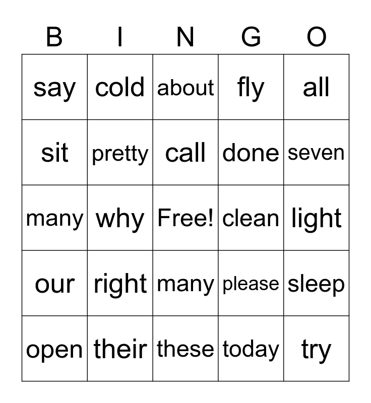This bingo card has a free space and 41 words: show, many, before, pretty, their, many, call, going, all, our, why, fly, try, light, clean, right, come, say, every, about, sleep, carry, these, done, cut, again, today, never, seven, read, once, cold, open, find, please, sit, take, use, give, be and together.