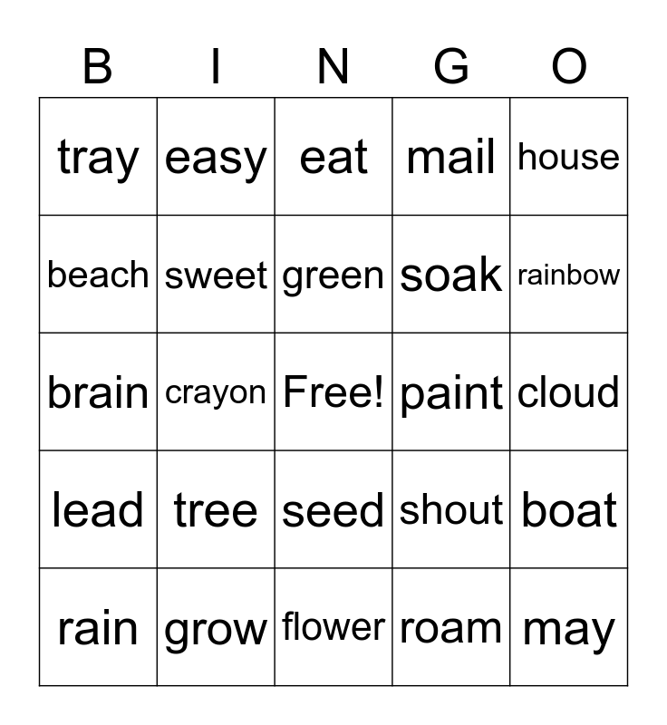 This bingo card has a free space and 28 words: boat, toad, soak, roam, beach, eat, easy, lead, paint, rain, brain, mail, grow, flower, rainbow, throw, tree, sweet, green, seed, tray, play, may, crayon, cloud, shout, house and couch.