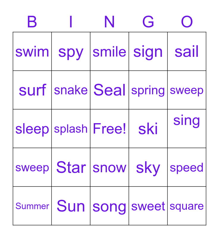 This bingo card has a free space and 24 words: Star, Sun, Seal, Summer, sail, swim, surf, spy, ski, snow, spring, sleep, sky, speed, snake, sweet, sing, smile, sweep, splash, square, sweep, sign and song.
