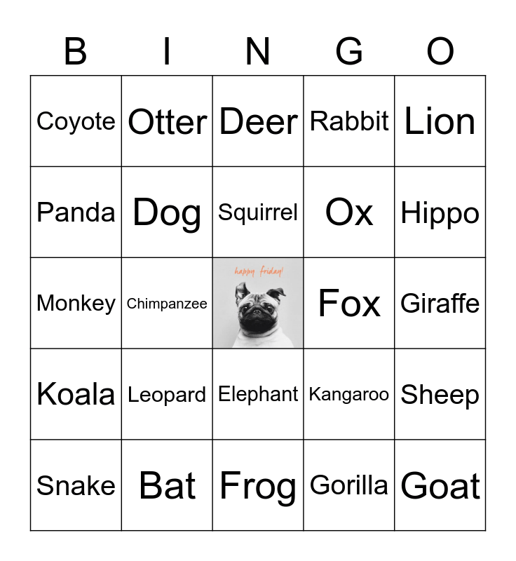 This bingo card has a free space and 30 words: Bat, Bear, Chimpanzee, Cow, Coyote, Deer, Dog, Elephant, Fox, Frog, Giraffe, Goat, Gorilla, Hedgehong, Hippo, Horse, Kangaroo, Koala, Leopard, Lion, Monkey, Mouse, Otter, Ox, Panda, Rabbit, Sheep, Snake, Squirrel and Walrus.