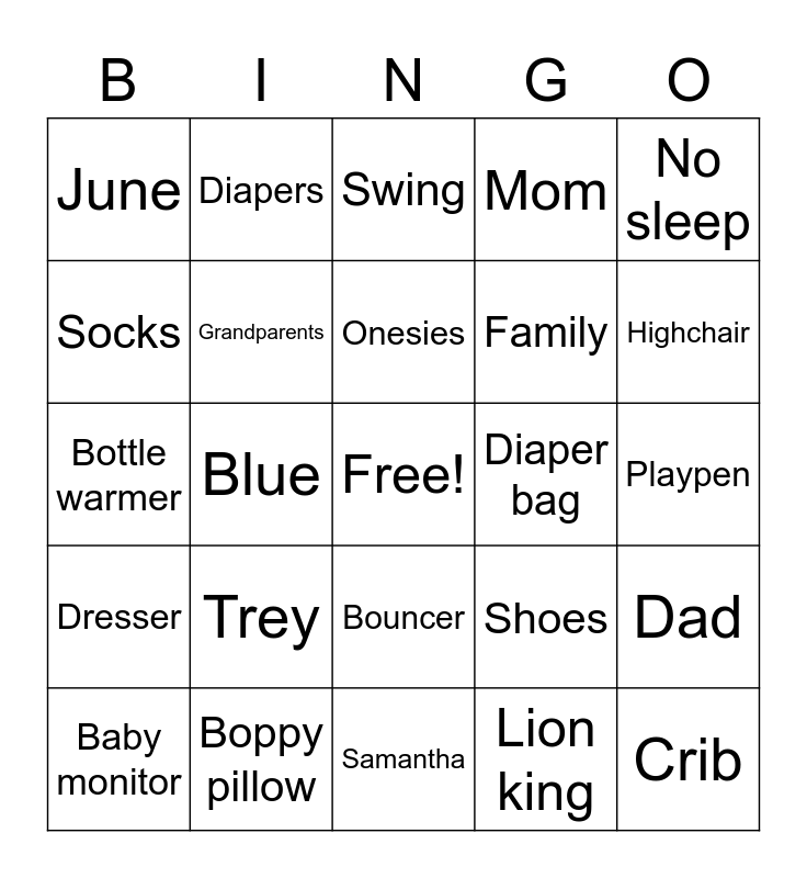 This bingo card has a free space and 50 words: Stroller, Crib, Wyatt, Samantha, Trey, Bottles, Diapers, Booties, Socks, Wipes, Grandparents, Mom, Dad, Shoes, Breastpump, Clothes, Onesies, Diaper bag, Labor, No sleep, Blue, Lion king, June, Family, Milk, Carseat, Highchair, Tub, Swing, Bouncer, Blankets, Bassinet, Towels, Burping cloths, Boppy pillow, Nolan, teething ring, Rattle, Toys, Playpen, Changing table, Bibs, Mittens, Nursing bra, Baby monitor, Bottle warmer, Nail clipper, Thermometer, Dresser and Hats.