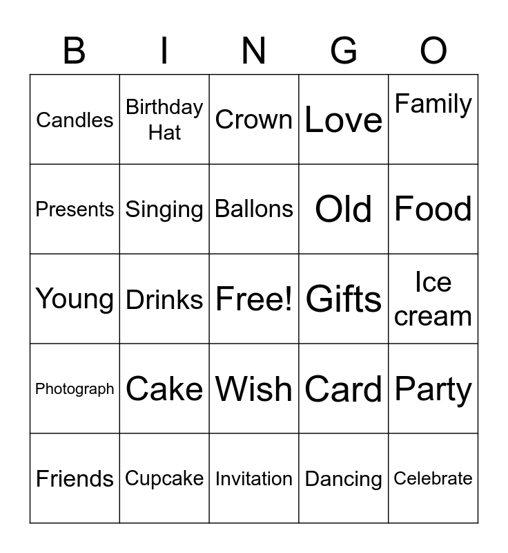 This bingo card has a free space and 24 words: Cake, Cupcake, Ballons, Friends, Family, Candles, Presents, Birthday Hat, Gifts, Wish, Old, Young, Card, Party, Singing, Dancing, Ice cream, Crown, Food, Drinks, Celebrate, Photograph, Love and Invitation.