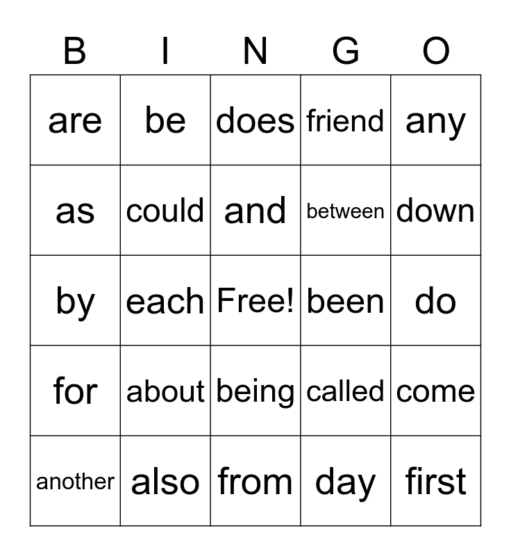 This bingo card has a free space and 24 words: about, also, and, another, any, are, as, be, been, being, between, by, called, come, could, day, do, does, down, each, first, for, friend and from.