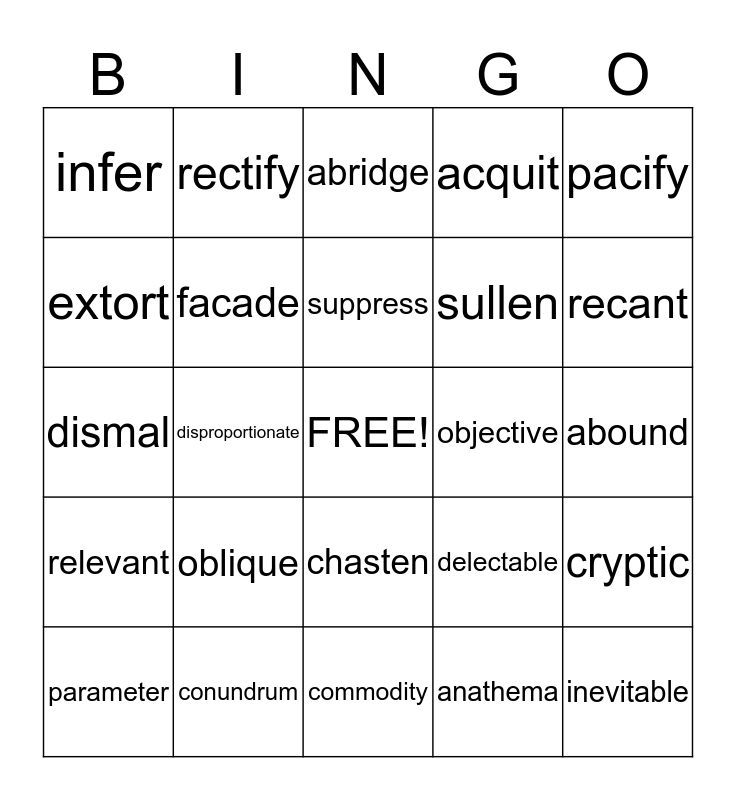 This bingo card has a free space and 24 words: oblique, conundrum, suppress, parameter, pacify, infer, extort, rectify, objective, chasten, sullen, dismal, delectable, cryptic, facade, anathema, abound, abridge, recant, disproportionate, inevitable, relevant, acquit and commodity.