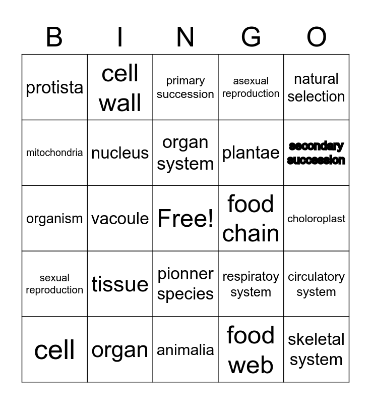 This bingo card has a free space and 24 words: tissue, organ, organ system, cell, natural selection, protista, mitochondria, cell wall, food chain, pionner species, plantae, organism, respiratoy system, circulatory system, nucleus, food web, choloroplast, primary succession, secondary succession, vacoule, skeletal system, sexual reproduction, asexual reproduction and animalia.