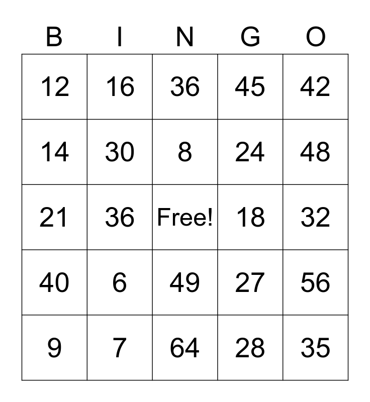This bingo card has a free space and 24 words: 6, 7, 8, 9, 42, 12, 14, 16, 18, 49, 24, 21, 27, 56, 30, 28, 32, 36, 48, 36, 35, 40, 45 and 64.