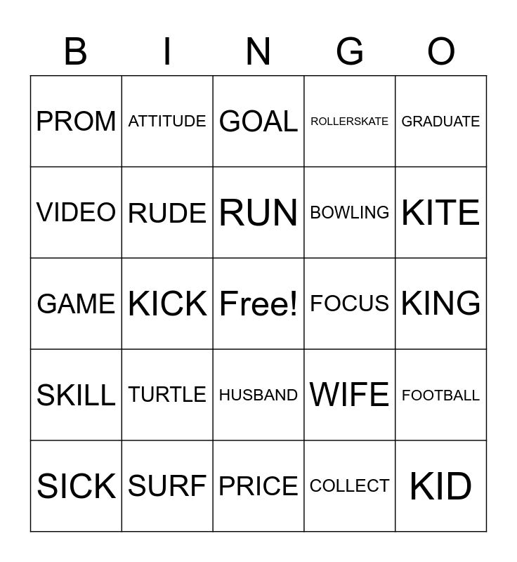 This bingo card has a free space and 39 words: WITH, VOLLEYBALL, BIRTH, RUDE, SICK, HUSBAND, RUN, DOLL, GRADUATE, SKILL, KICK, ROLLERSKATE, KID, KING, FOCUS, TURTLE, C.I., PROM, BRACELET, WIFE, VIDEO, PRICE, BOWLING, KITE, TOY, RIVER, LIE, SOLD-OUT, BOOTS, ATTITUDE, AWARD, CRAZY, GOAL, SURF, COLLECT, RIVER, FOOTBALL, GAME and SPORT.